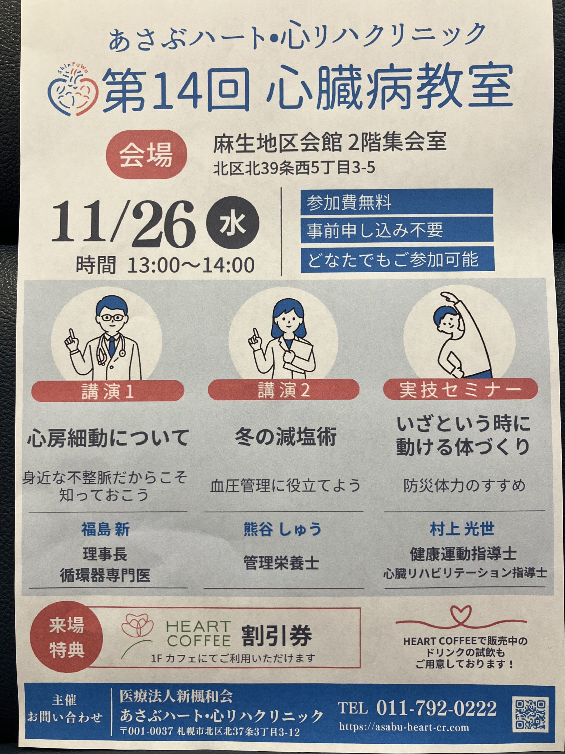 心臓病教室では当院で医師、スタッフが麻生地域住民のために無料で開催しております市民向け公開講座です。