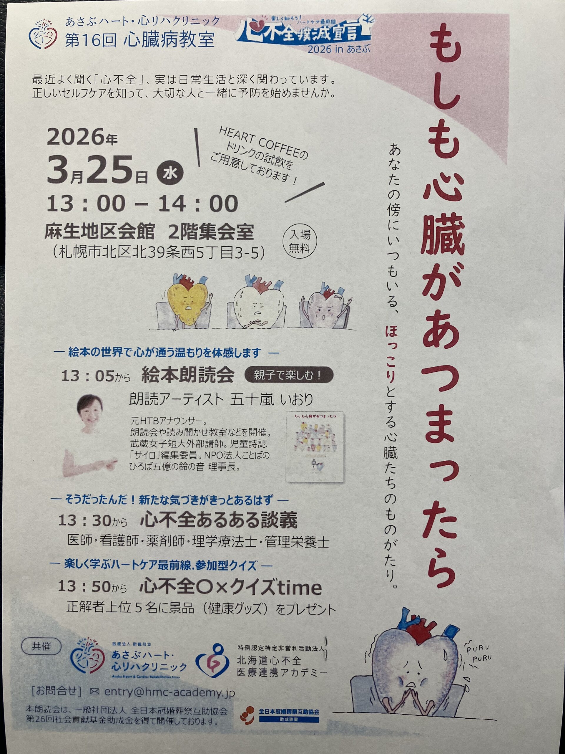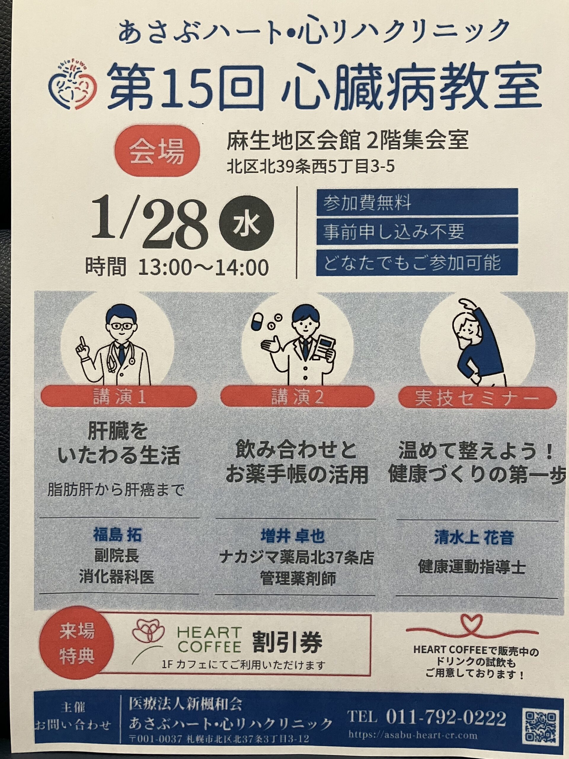 心臓病教室では当院で医師、スタッフが麻生地域住民ために無料で開催しております市民向け公開講座です。